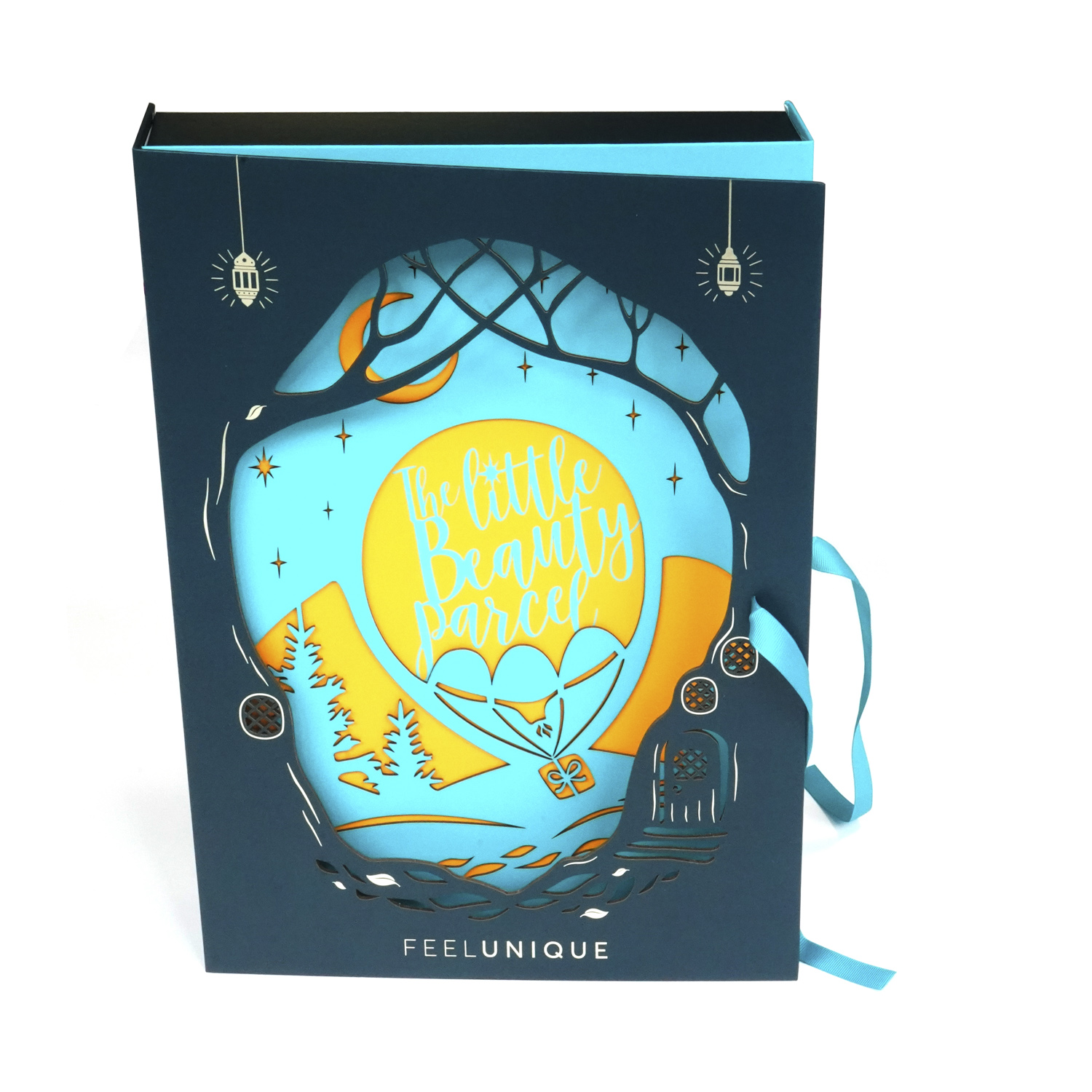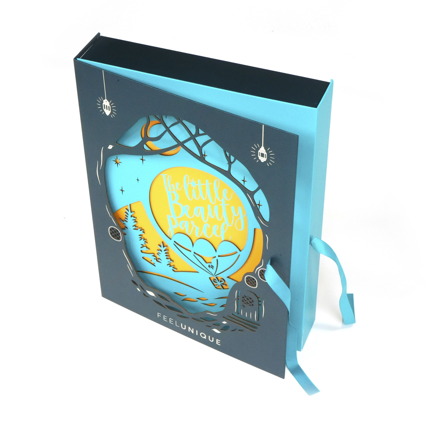 设计独特的蓝色礼品包装盒特殊书籍样式盒,带有丝带